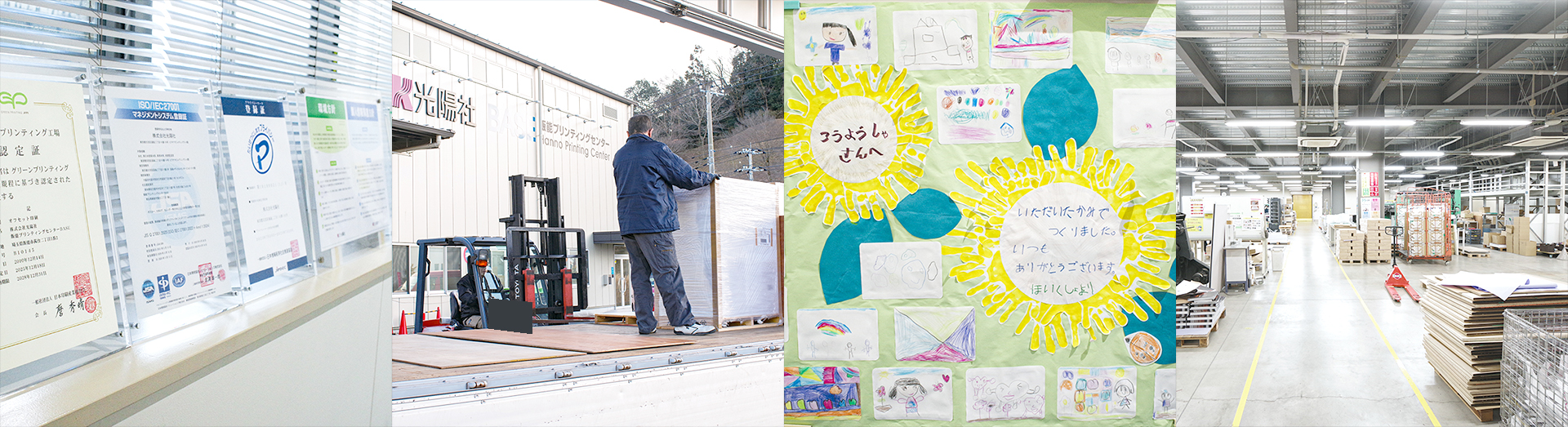 また、印刷に用いるアルミニウム製の版の完全無処理化により、現像液などの薬品を一切使用しない刷版工程の確立や、植物油インキやノンVOC(揮発性有機化合物)インキの使用、湿し水冷却循環装置導入によるインキと水の削減など、数々の環境配慮施策を実施しています。